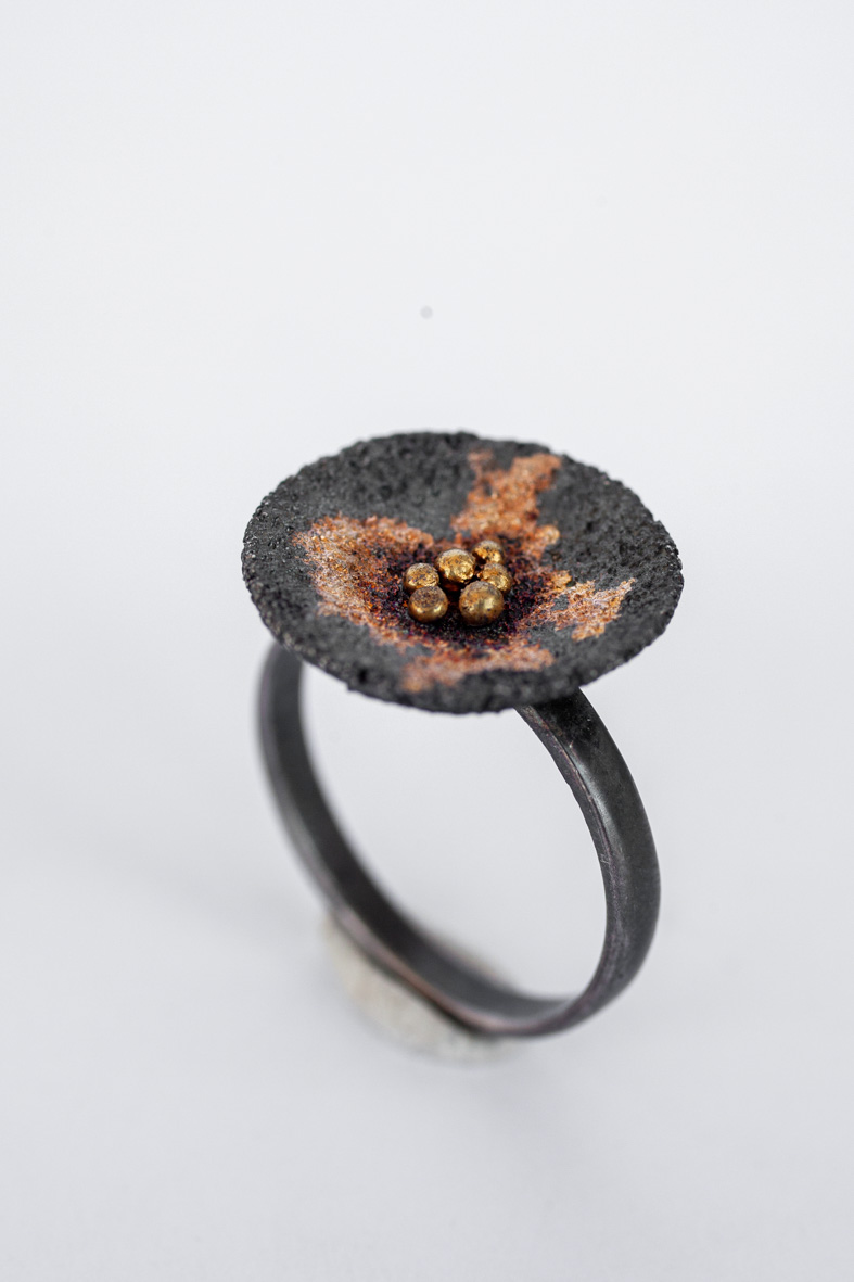 Una pieza caracterizada por un pequeño contenido brillante rodeado por una oscura y fuerte textura, con bonitas manchas de soldadura expandiendose alrededor.